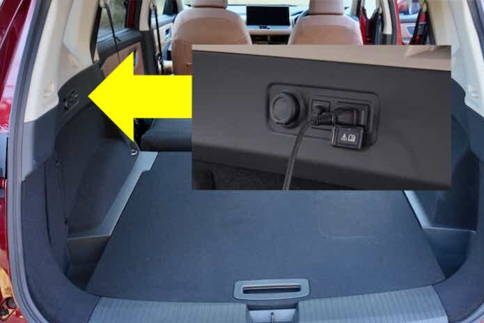 エクストレイルには、電気ケトルや冷蔵庫、ドライヤー、電気毛布などキャンプや車中泊で使いたい家電製品が使えるAC100V 1500Wコンセントが装備(試乗車の「G e-4ORCE」は標準装備。一部グレードはオプション)されています。