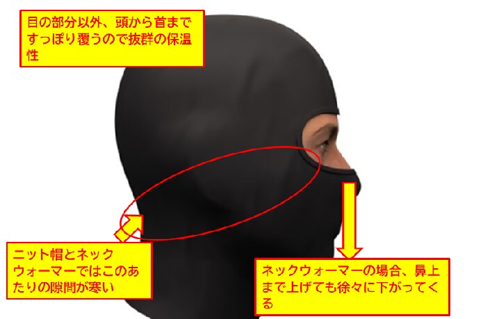 しっかりと頭部を覆って防寒するので、氷点下の風が吹く冬山では着用しているのとしていないのでは大違い。隙間が空いたり、ずり落ちたりしてしまうネックウォーマーとニット帽に比べ保温性抜群です。