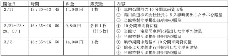 「1両まるごと車内独占チケット」は、運転台を含む車両貸切(10分間)に加え、ノベルティ(キーホルダー)、特製サボ(計3枚)、錦川鉄道一日乗車券がセットになった商品です。 価格は開催日により異なり、9,840円~14,040円(税込)。2月5日16:30から3月2日16:20まで、アソビュー!にて数量限定(計7枚)で販売します。