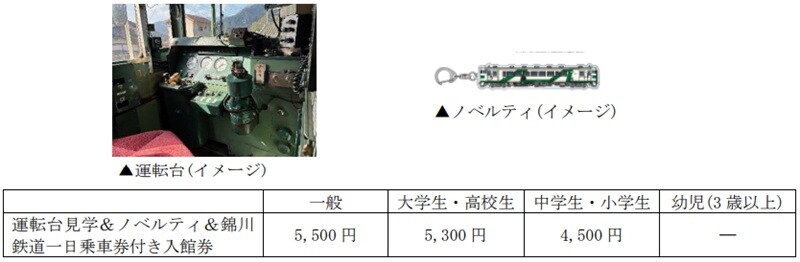 また、「運転台見学付き入館券」も販売。こちらは運転台見学(4分間)、ノベルティ、錦川鉄道一日乗車券、入館券がセットになっており、2月6日16:30から3月1日16:00まで、アソビュー!で販売します。