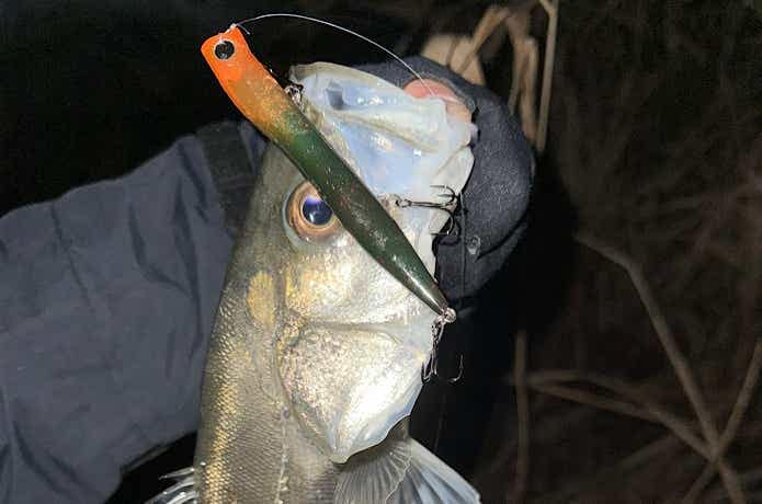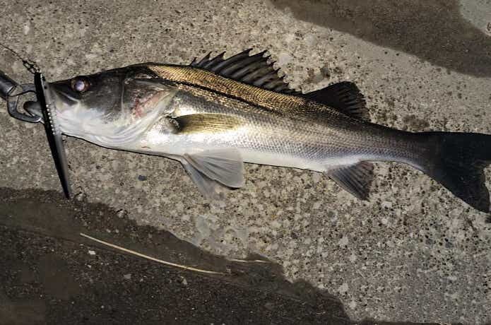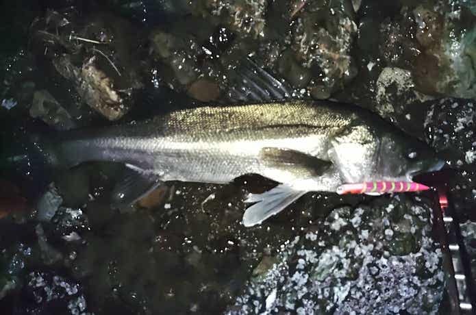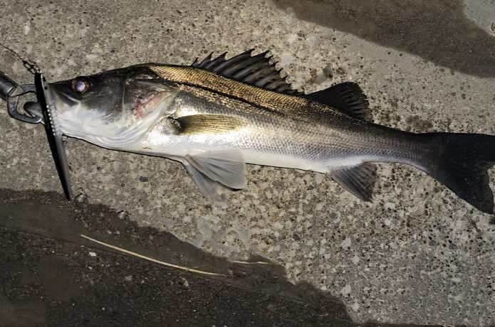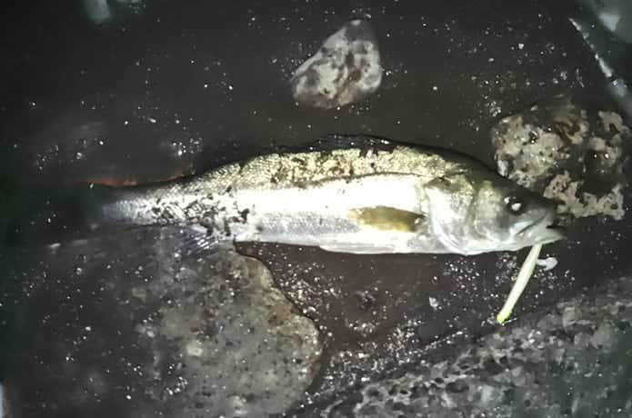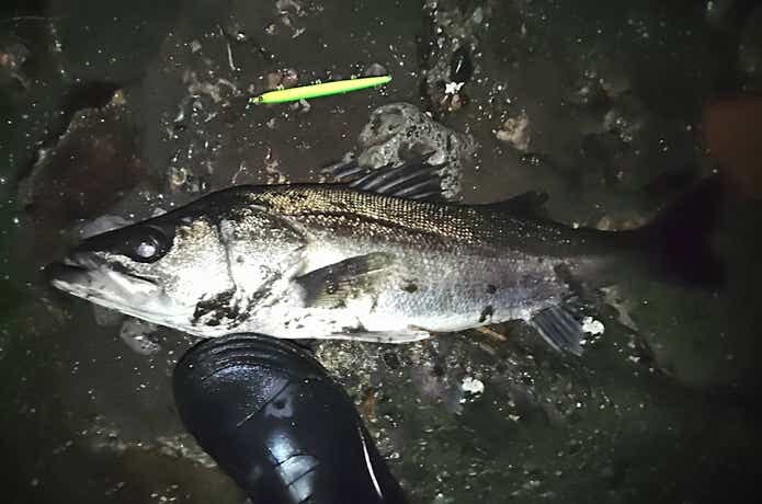 そして、下げが効いてきた遅めの時間帯に、シーバスを1本キャッチ。