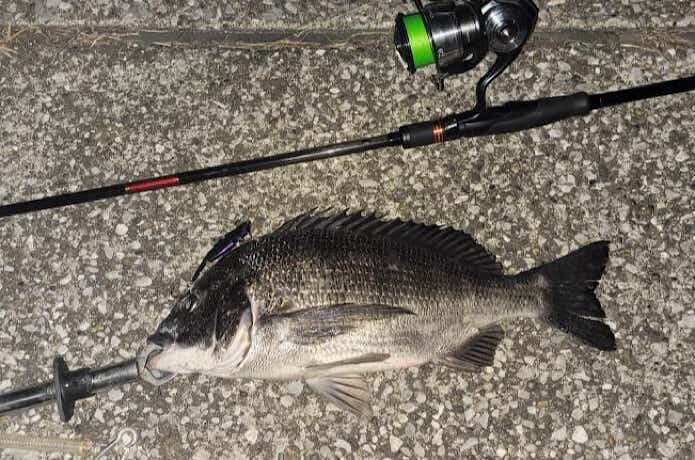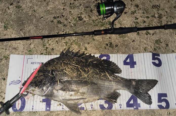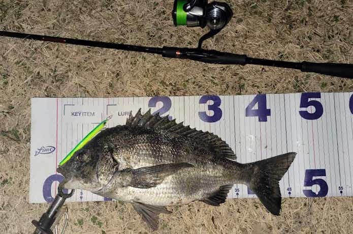 風が強くて釣りにならず。時合いの時間も終わった後に別場所に移動しました。 そこでは、バイブレーションでチヌが2本が釣れました。