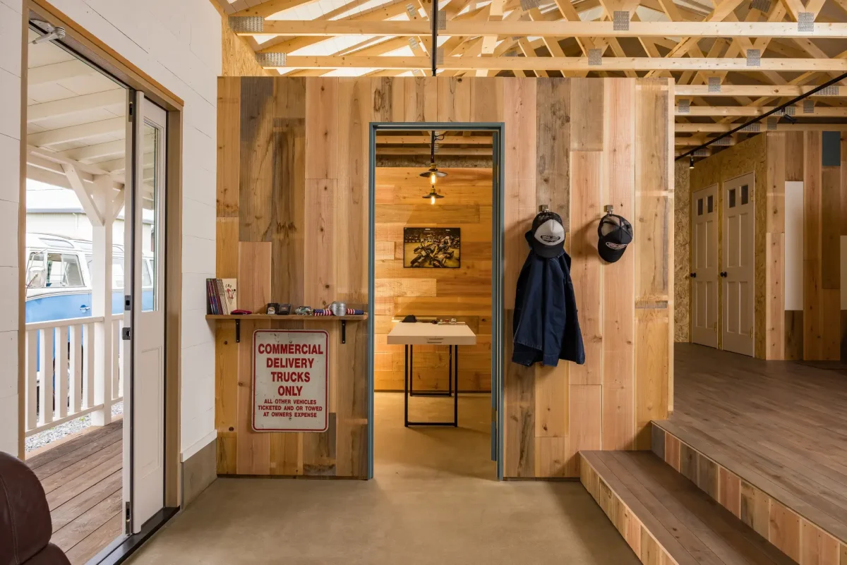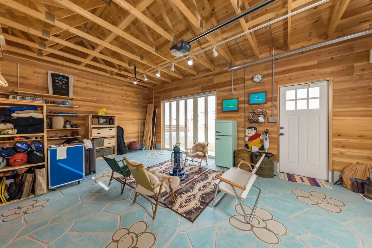 弊社のガレージは木造枠組み壁工法(以下2×4工法)を採用しており、内部の柱がなく大空間が取れる構造となっております。耐震性にも優れ、また木造であることで鉄骨では難しい後々のDIYも容易にでき、自分だけのオリジナルな内装を仕上げることもできます。用途はさまざまで、愛車を守るガレージ、キャンプギアや釣り道具など趣味の収集、保管部屋やおしゃれな店舗にもお使いいただけます。実際にガレージの展示場では大きさや質感、内装やオーバースライダードアの動きなど体感できます。