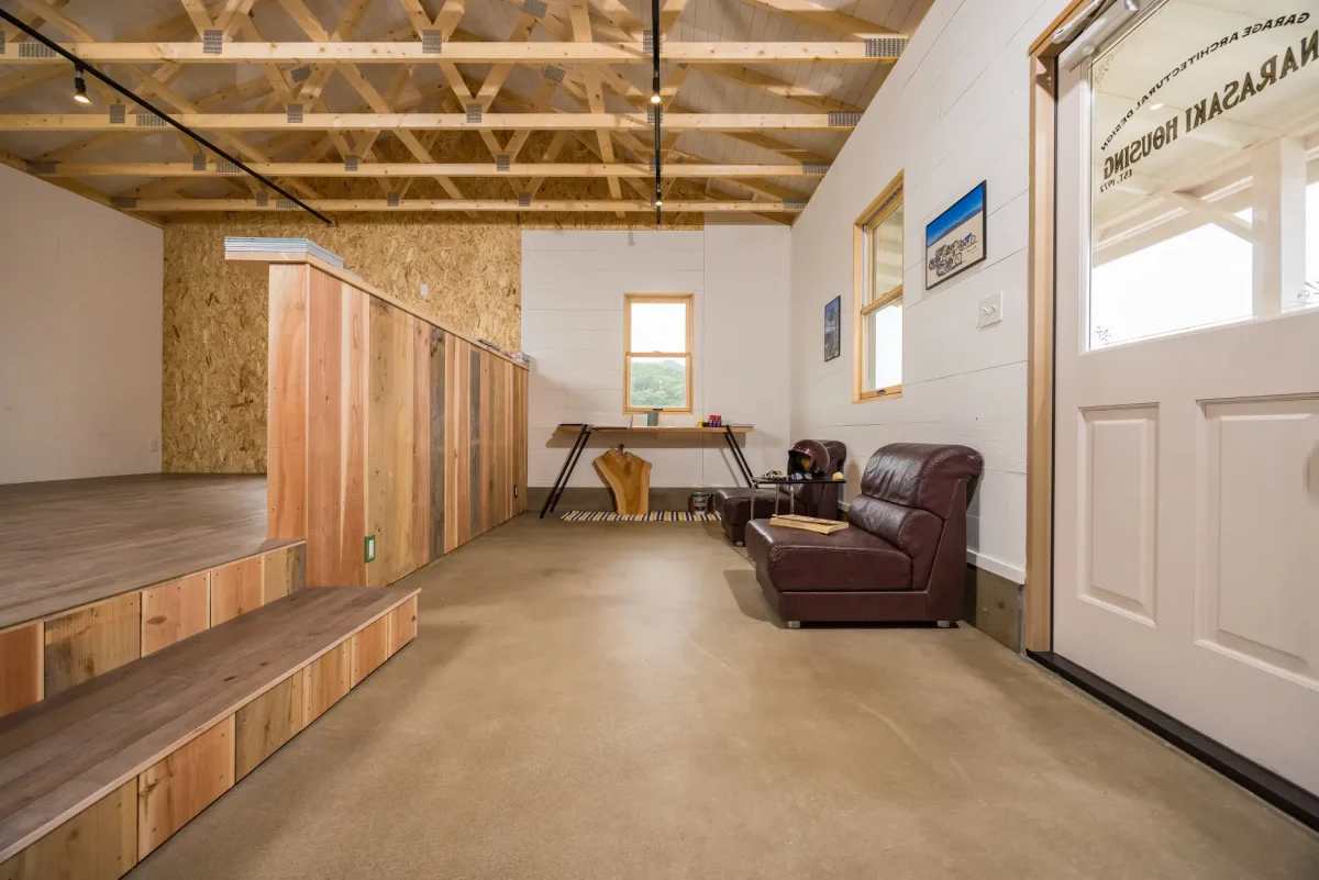 キャンプギアのお手入れと収納用のガレージにとどまらず、ホッと一息できる素敵なプライベート空間をアメリカンガレージで建築させていただきました。