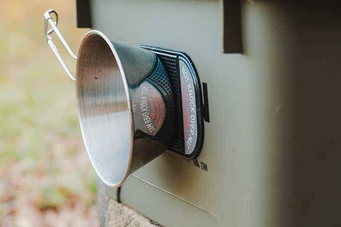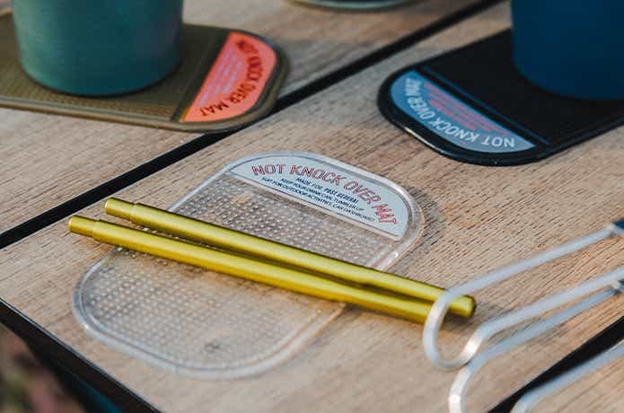 クーラーボックスの側面に「NOT KNOCK OVER MAT」を貼っておくのも便利。水洗いした食器を干しておく場所としても使えるし、栓抜きなど失くしがちな小物の置き場にしてもいいですね〜!