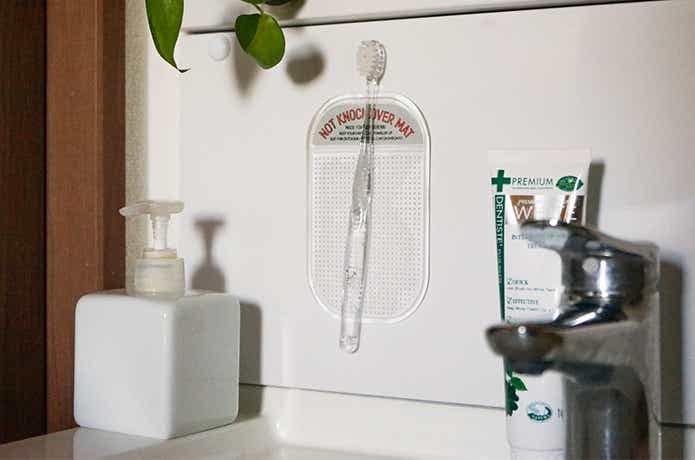 洗面所でもピタッと粘着! 縦置きもできるので、使用後の少し濡れている歯ブラシの乾燥にもちょうど良いかも。