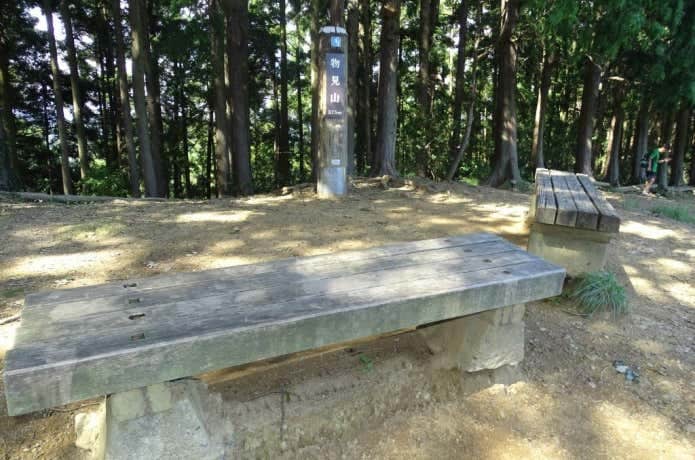 スギやヒノキが並ぶ登山道を歩いて行くと物見山山頂に到着。展望こそありませんが、広々としたスペースにはベンチもあるので休憩におすすめです。