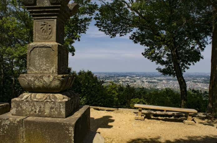 高指山からほどなくすると日和田山山頂が見えてきます。石塔の置かれた山頂は、日高市街を一望できるなど気持ちのいい景色が広がる絶景スポット!