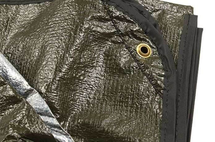 生地は頑丈で、地面に直接敷いてグランドシートとして使ったり、雨風を避けるための簡易シェルターとして張ったりと、多用途に対応。四隅にはハトメが付いており、ペグやロープを使って固定できるため、状況に応じた使い方がしやすくなっています。
