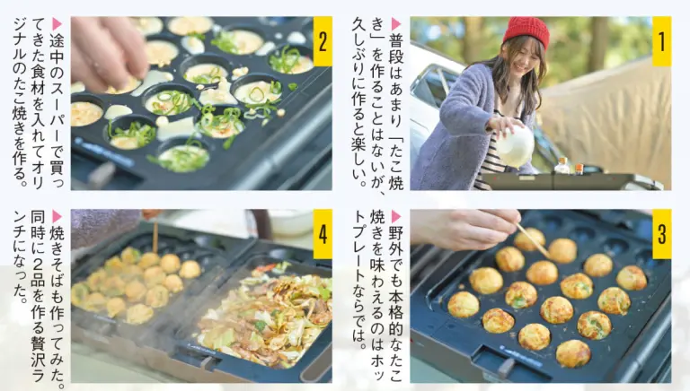 エクリプスクロスPHEVの電源から取れるのは消費電力1500Wまで。今回利用したアイテムはすべて1500W以下だったので問題なく使用できた。なお、同時使用する場合は1500Wを超えないように注意が必要だ。今回はホットプレートでたこ焼きと焼きそばを作ってみた。お手軽ランチながらアウトドア料理を満喫できた。食後はドリップコーヒーを堪能。