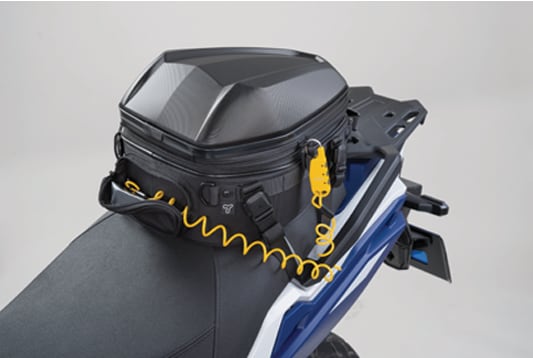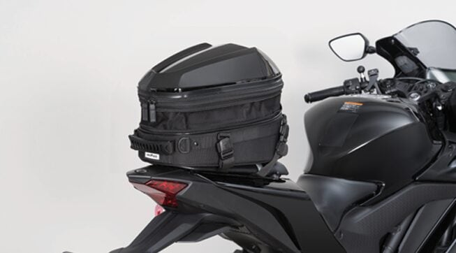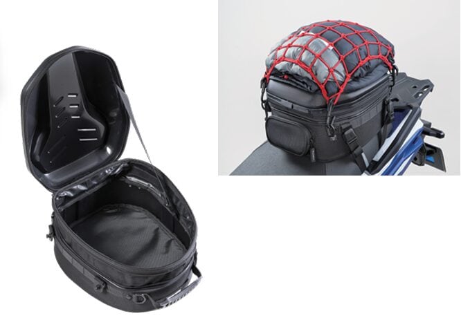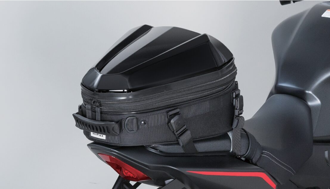 リアシートの限られた積載スペースを最大限活かす、大容量のシートバッグ。少し余裕を持たせた底面形状で広い開口部、上に積むことを考慮した形状のPCシェル、+4ℓの拡張機能と機能満載のツーリング仕様。