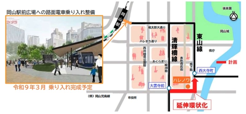 岡山市は2026年1月26日、路面電車の延伸環状化について、運行事業者である岡山電気軌道と合意し、事業計画案がまとまったと発表しました。仮称「ハレノワ線」として、2029(令和11)年度中の運行開始を目指します。