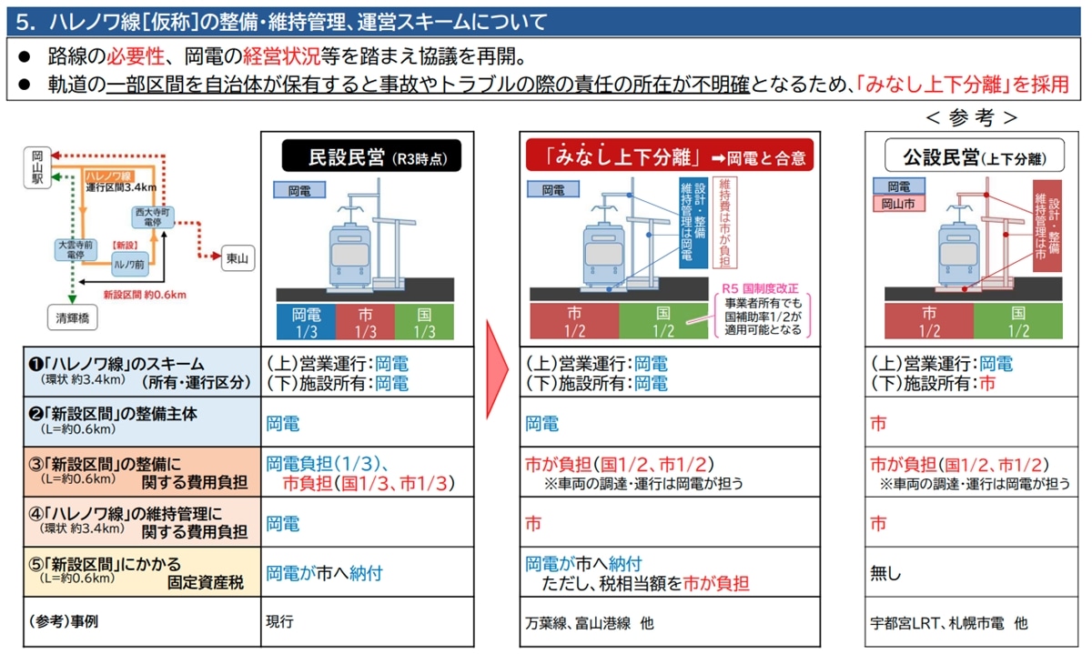 岡山電気軌道の考えでは、同社は厳しい経営状況にあり、老朽化した車両の定期的な更新も必要な状況で、新たな設備投資は困難です。路線の必要性や岡電の経営状況などを踏まえた上でハレノワ線(仮称)の整備・維持管理、運営スキーム等を協議した結果、市が施設の維持管理費や固定資産税相当額を負担する方針となりました。