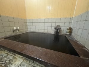 泉質は、含硫黄-ナトリウム・カルシウム-塩化物温泉。54度で湧く源泉を、どちらのお風呂も掛け流しで利用しています。湯船に満たされた湯は、まるで墨汁のように漆黒。温泉らしい硫黄と、石油のようなアブラの香りが漂います。舐(な)めてみると、強めの塩ダシ味と相まって、煮詰めた豚骨ラーメンのスープのような濃厚な味わいが面白く、思わず笑ってしまうほど個性が際立っています。