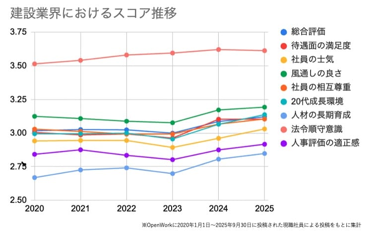 転職・就職のための情報プラットフォーム「OpenWork」を運営するオープンワーク(東京都)は、長時間労働が常態化していた建設業界が、2024年4月の労働基準法改正によって時間外労働の罰則付き上限規制が適用されたことで、どう変わったのか、サイトに寄せられた評価レポートをもとに、最新状況を発表した。