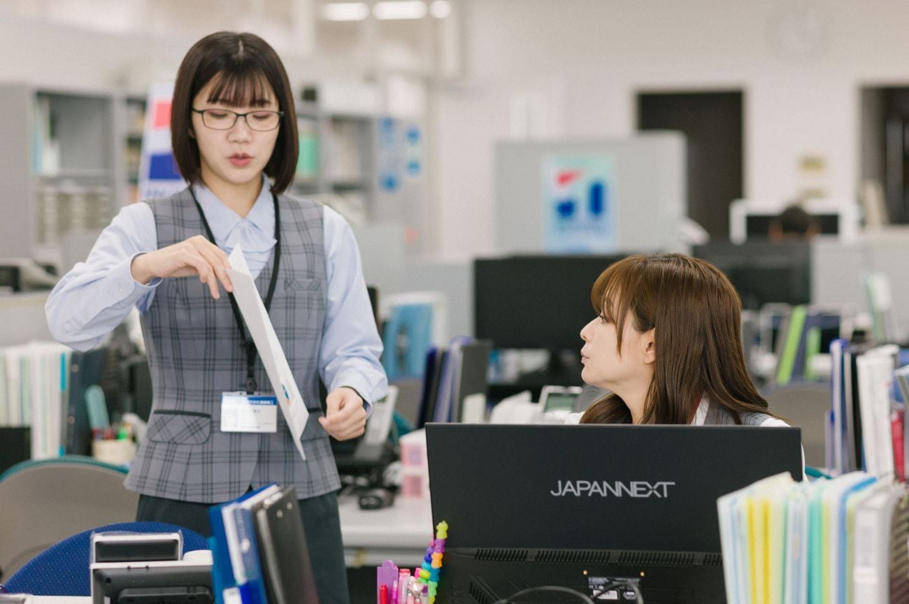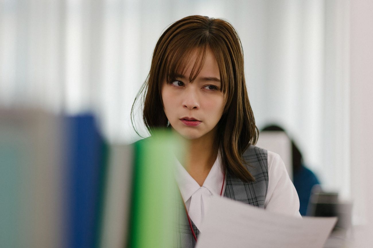 (C) 猪熊ことり/新潮社・「婚活バトルフィールド37」製作委員会赤木(加藤ローサ)に書類の不備を指摘する青島(福田麻貴)