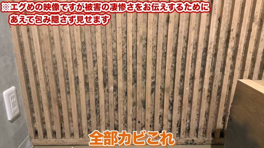 被害から2カ月後の10月末に撮影された映像では、ベッドフレームと木の壁にカビが大量発生し、木製のドアが割れ、シャワールームが泥まみれになっている部屋の様子が映されました。てつやは「すす汚れた感じになってますけど、多分これ全部カビです。最悪…」「廃墟みたいにズタボロになってて」と落胆。