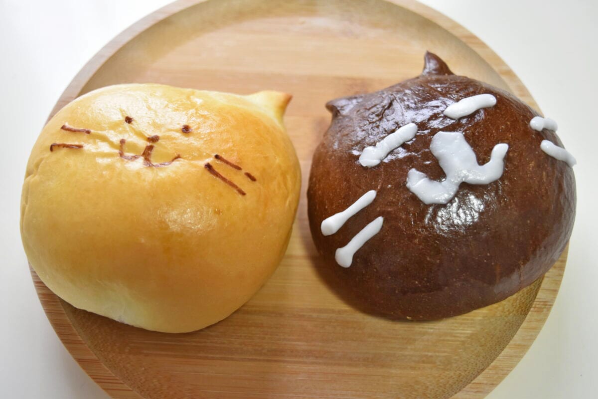大麻エリアの「パン屋ねこのさんぽ」は、北海道産小麦100%を使用し、素材もできるだけ北海道産や江別にゆかりのあるものを選ぶベーカリーです。看板商品「ねこぱん」は、北海道産牛乳で仕込んだ生地にカラメルソースとプリン味クリームを重ねた人気商品です。ハロウィン限定だったチョコ味の「くろねこぱん」もレギュラーに加わり、いつも仲良く並んでいます。購入の際は「一匹」と数えるのも楽しいです。
