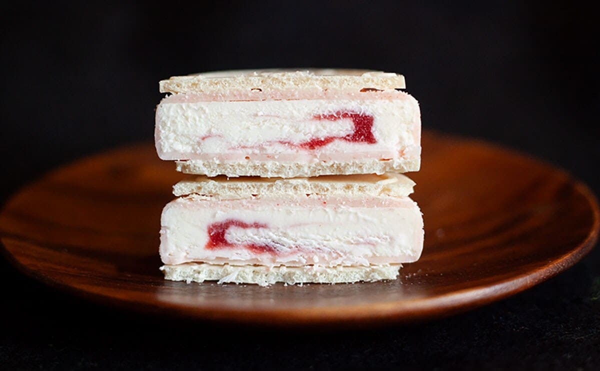 いちごの赤とミルクの白、2つのコントラストが映える見た目と、贅沢なマリアージュが楽しめるという同商品。メインとなるのは、果肉感のあるいちごソースを加えたミルクアイスクリームとのこと。そのミルクアイスクリームをいちごコーティングで包み、さらにホワイトウエハースでサンドしたのだとか。