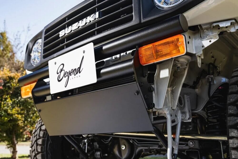 「CODE26」のフロントフェイスは、見る者にJA11時代の記憶を呼び覚ますデザインが特徴である。まず注目すべきは、純正よりも大幅にショート化されたフロントバンパーだ。これにより、ジムニー本来の軽快さと力強さが強調される。このショートバンパーには、JA11の純正パーツである角型のスモール&ウインカーランプ(車両の幅を示すための灯火であるスモールランプと、方向指示器のウインカーランプが一体となったもの)が組み合わされる。BEYOND JAPANが開発した「ウインカーステー11」を使用することで、このJA11用ランプが現行ジムニーのショートバンパーに自然な形で装着可能となる仕組みである。また、スモール&ウインカーランプは社外品のクリアタイプなど、ユーザーの好みに合わせて選択できるため、よりパーソナルな表情を演出できる。