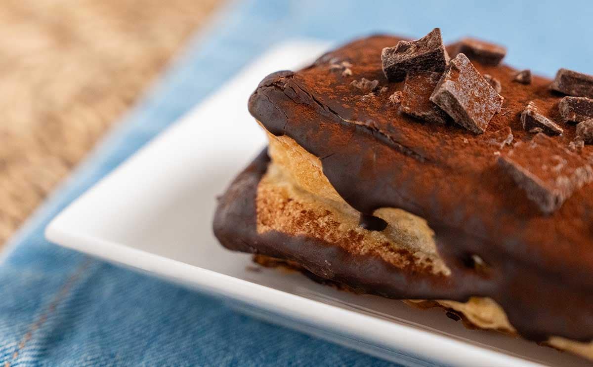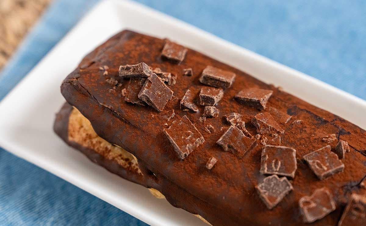 長方形のデニッシュ生地の上にチョコがたっぷりとトッピングされています。