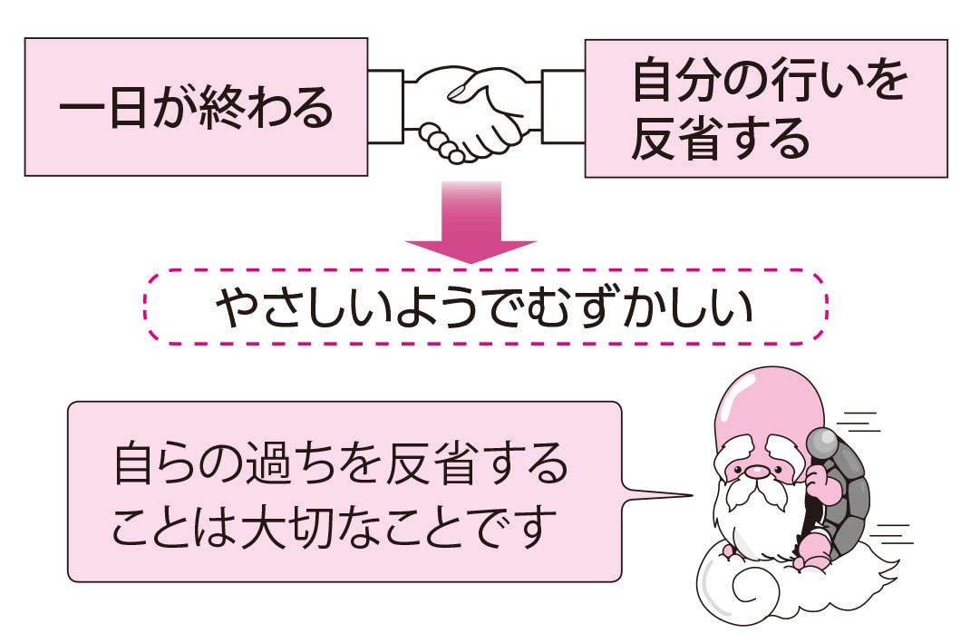 反省することで、謙虚な気持ちをもつことができます。人生をより善く生きるためには、反省して問題点を改(あらた)め、更なるステップアップを図ることを忘れてはなりません。