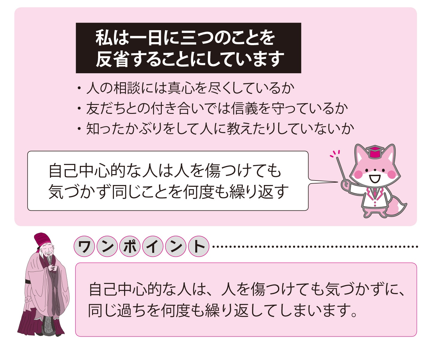 <訳>曽子(孔子の弟子)がいった。私は一日に三つのことを、反省することにしている。ひとつは、人のために考えて相談にのる際に、真心を尽くしているだろうか。友だちとの付き合いで信義を守っているだろうか。また、しっかりと自分自身が身につけてもいないことを、知ったふりをして人に教えるようなことはしていないだろうかと。