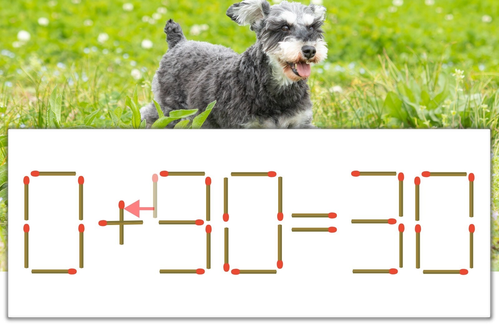 「9」を別の数字に変化させると答えが導き出せます。「9」のマッチ棒を1本移動して、「-」を「+」にしてみましょう。すると、「0+30=30」が成立します。