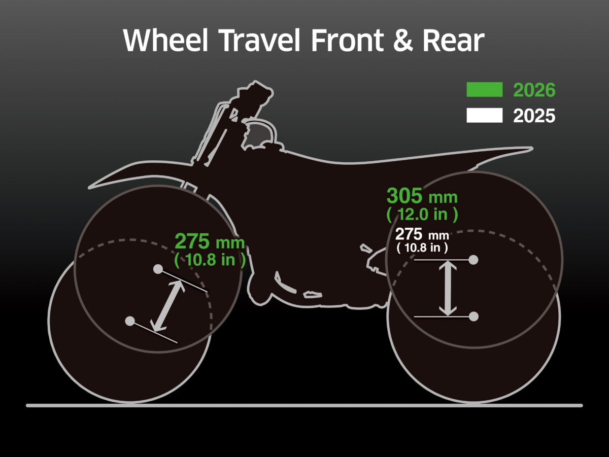 2026年モデルでは、カワサキのフルサイズモトクロッサーから着想を得たシャーシコンポーネントを継承しつつ、全てのモデルに従来モデルより大径化したインナーチューブ径ø43mm 倒立フロントフォークを採用。調整機構をフルアジャスタブルとし、アウターチューブには耐摩耗性を向上させるカシマコートを施工しています。また、KX112/KX85 Lのリヤサスペンションストローク量は、フルサイズモトクロッサーと同等の305mm に増加しています。※KX85は変更なし
