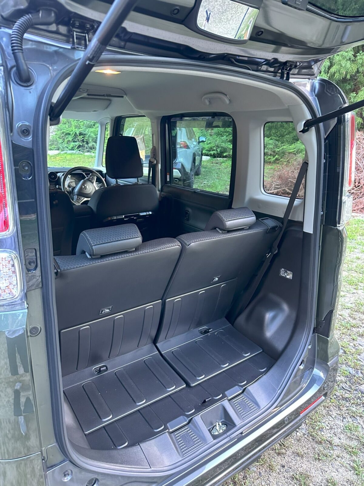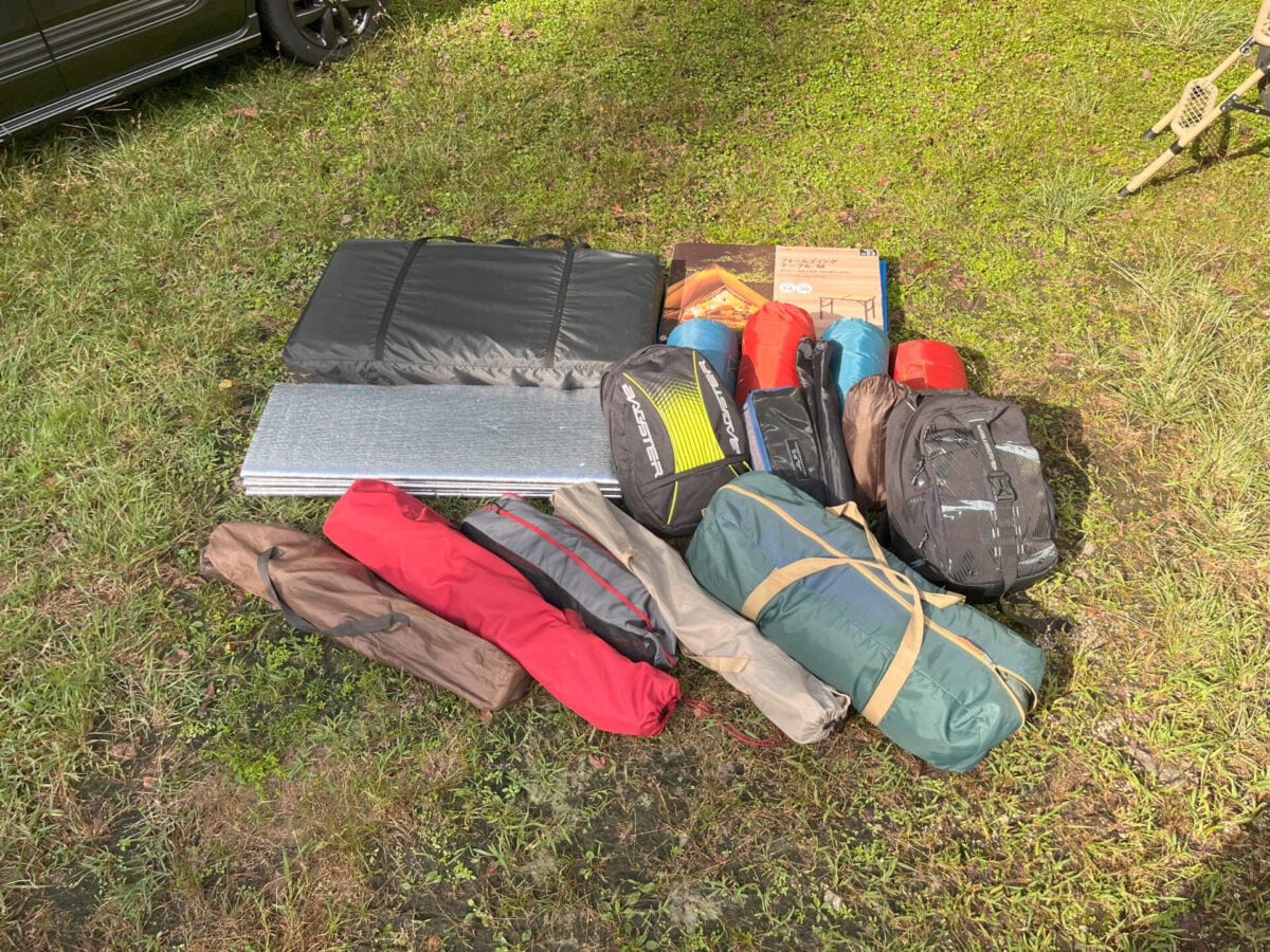 最近の軽の車内空間は広いと言えど、後部座席に人が乗るとギア収納スペースはかなり限られてしまいます。ソロキャンプと違い、ファミリーキャンプは人数分の寝具やチェアなど荷物が嵩張ります。食べ物や飲み物を入れたクーラーボックスなどで軽自動車の荷室スペースはほぼ一杯になってしまいます。