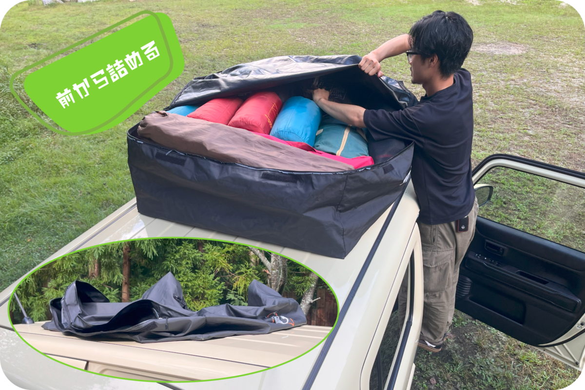基本的に、柔らかくて軽いシュラフなどの寝具、インナーマットなどの敷物系を積んでください。敷物系を底に入れるとルーフへの影響が少なくなります。