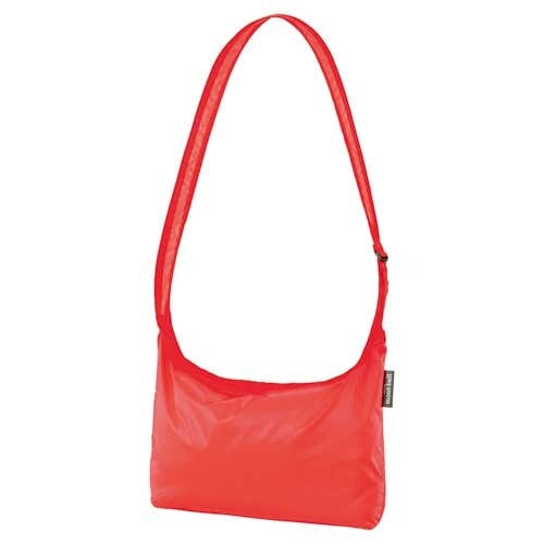 収納時は手のひらサイズになる超軽量ショルダーバッグ。雑誌や書類、小物を収納しやすい横長形状で、開口部はジッパー付きです。ショルダーテープは長さの調節ができ、余った部分は本体に収納可能。B5サイズ対応です。