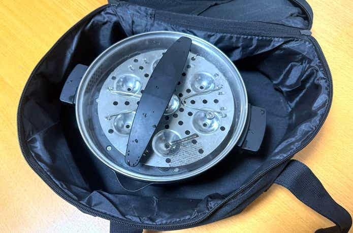 サイズは約幅259×奥行215×高さ139mmと、鍋1つ分の容積で済むんです。自宅での置き場所にも困らないし、携行時もコンパクトでスムーズ。