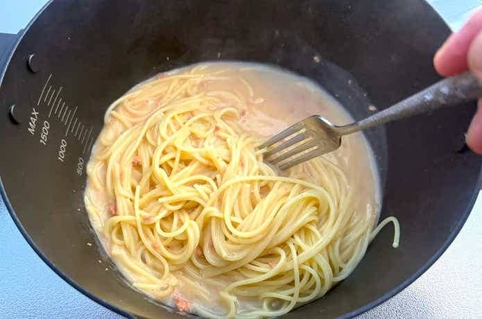 この中でパスタソースを「和える」と食器も不要だし、ペペロンチーノのような「炒める」調理も1つの鍋で続けて行えます。いやこれ、他にこんなことできるギア今までなかったよね……。