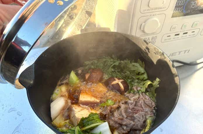 ここからはいよいよ、電気調理器としての真価を試しましょう。冬場、夜は幕内に籠るので、一酸化炭素発生リスクがないのがありがたい。車中泊でも便利ですし。