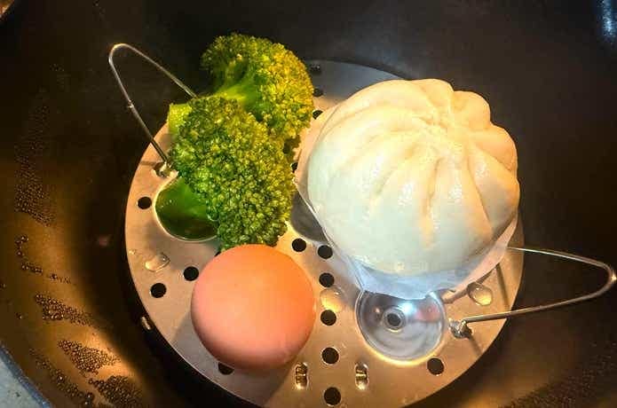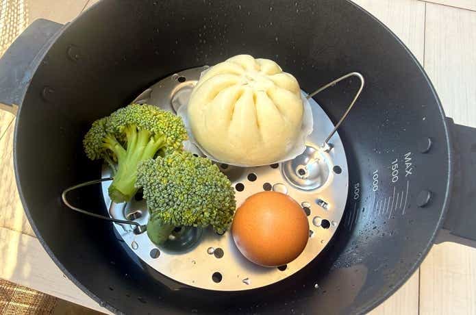 「なべプレート」を「本体」にセットし、水を100mlほど入れてから「蒸し皿」を使って肉まん・卵・ブロッコリーを一気に蒸し調理します。