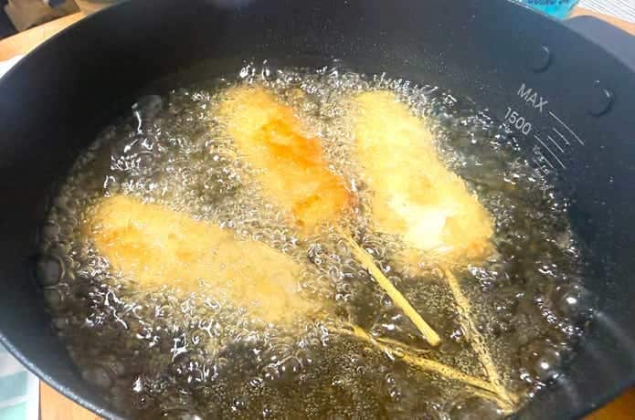 ヒーター本体が230℃まで上がるスペックなので、冷凍の串カツをどんどん揚げていきます。