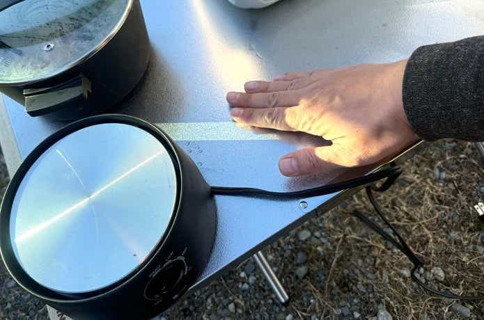 一方で、ヒーター部分はいつまでも温度が下がらず。この日、気温は10℃以下で風もあったのに、15分放置してもまだ触れないレベルの熱さ……。
