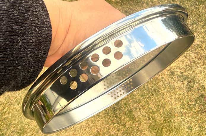 「ふた」両サイドには大小2種の湯切り穴があり、パスタや野菜を茹でた後も、ザル要らずで湯切りが完了。装備も洗い物も減って、この辺りもまさにキャンプ向きと言えますね。