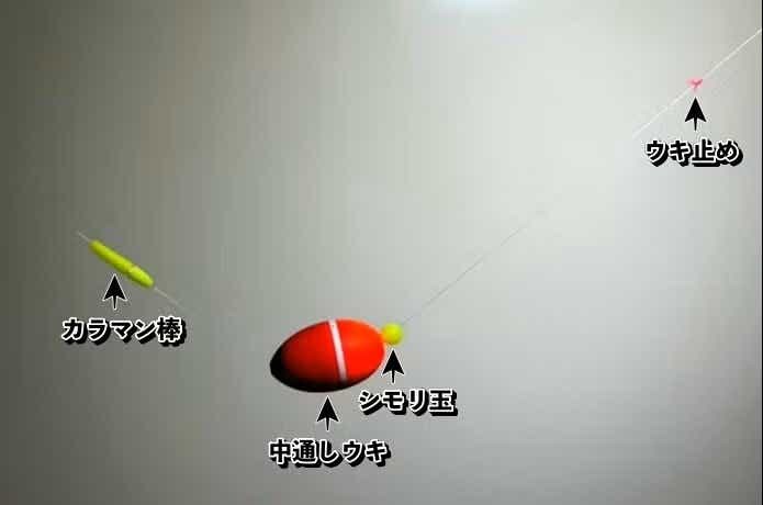 列挙すると上から順番に、ウキ止め→シモリ玉→円錐ウキ→カラマン棒→(極小スイベルでもOK)→ハリス直結→ガン玉→針です。