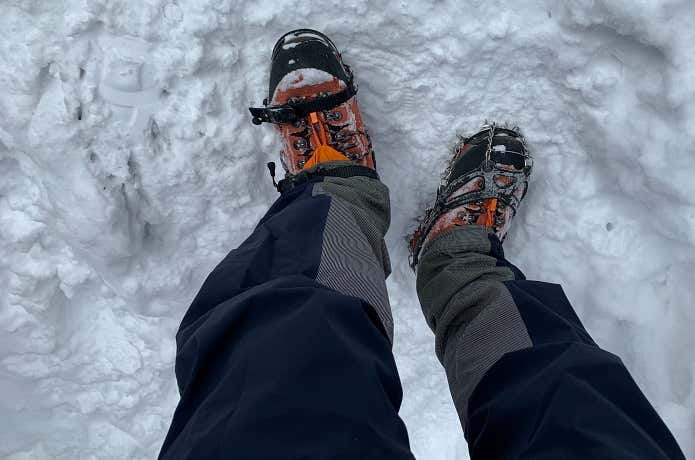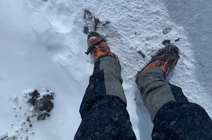 軽アイゼンが安心。チェーンスパイクより爪が長いため、傾斜のある雪面でも踏ん張りがきく。