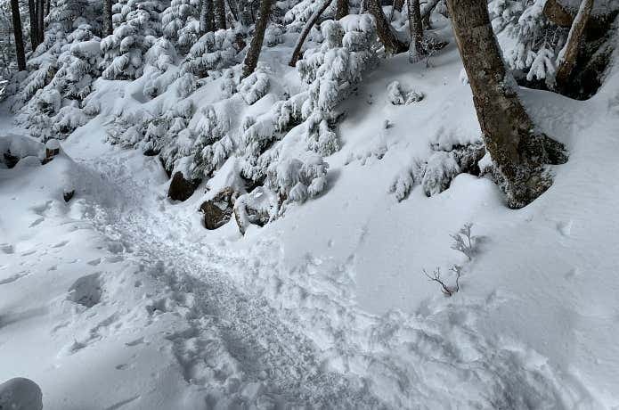 - 積雪が少ないアイスバーン状の登山道や一部が凍結した登山道
