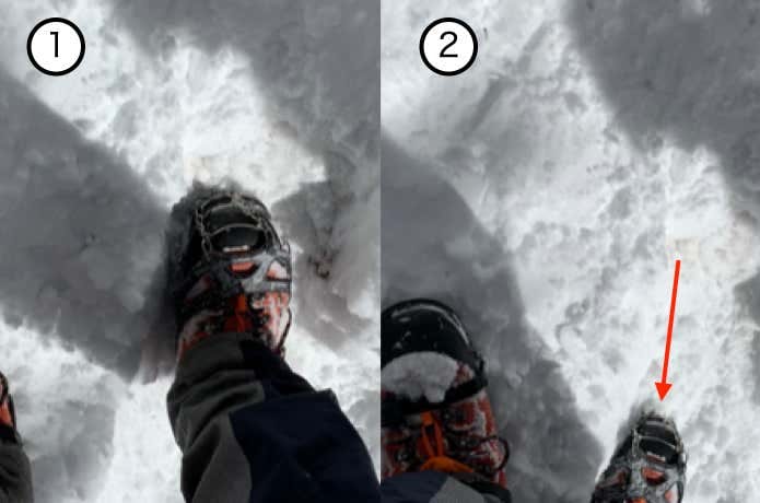 ①区間ではストレスになった軽アイゼンの爪ですが、傾斜があり雪に覆われている②区間では効果を発揮。「フラットフッティング(※)」で足を置いた時に、中心部分の爪が雪面をしっかりとらえ、安心して次の一歩を踏み出せました。