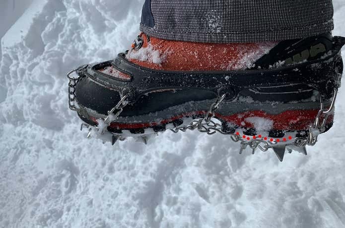 さらに雪の斜面をスリップすることで余分な力がかかり、靴底とチェーン部分にゆるみも発生しました。傾斜がある登山道では、チェーンスパイクの弱点が露呈する結果に。