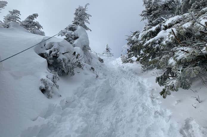 しかし山頂直下は、斜面を直登するため傾斜のきつい登山道が続きます。さらにこの日は気温が低く、多くの登山者によって踏み固められた道が凍結状態に。雪道がツルツルとした「滑り台」のようで、スリップしそうになる体験をしました。