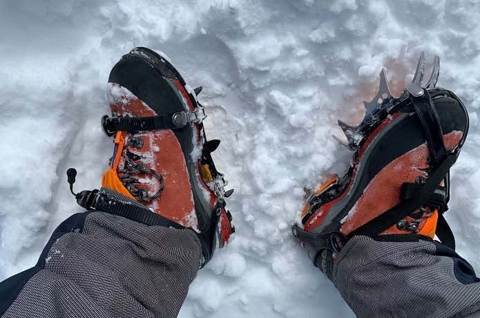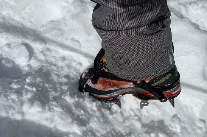 こうした場所では、つま先に前爪があり、かかとまで鋭く長い爪で覆われた多本爪アイゼンがベスト。