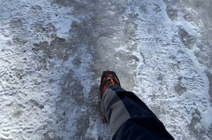撮影:washio daisuke(右足にチェーンスパイク・左足に軽アイゼンを装着)