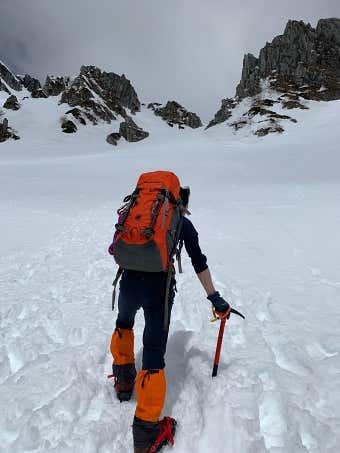 傾斜が急でキックステップでの登降やつま先をL字に開いてのトラバース時には多本爪アイゼンが必要。また凍結して爪が刺さりにくい場所でも力を発揮します。平らな道での利用も可能ですが、重くて爪が長いため、一歩を進めるのに快適とはいえません。