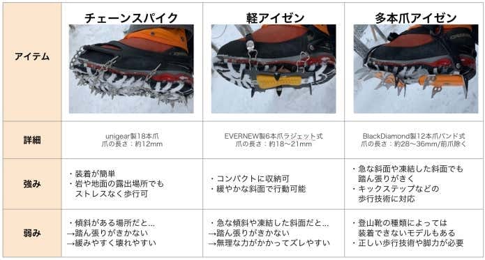 より適切なアイゼン選びをするために、まずはそれぞれの特徴を押さえましょう。