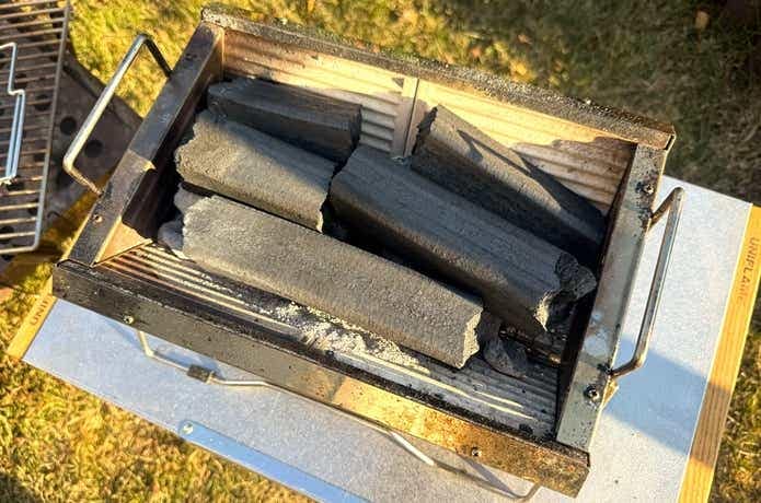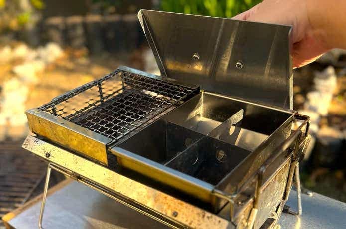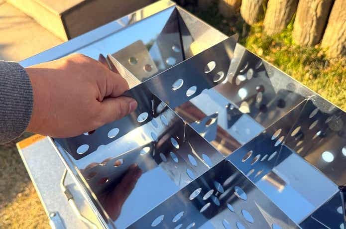 画像では着火前に乗せたシーンですが、炭火が詰まった状態でもスムーズにセットできます(ただし、耐熱グローブや軍手を着用しましょう)。